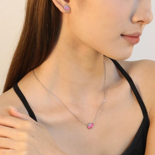 8.6x6.4mm Pink Enamel Elephant Stud Earrings + 12.2x9mm Pendant Set - 0.3mm Chain (45+5cm) & 6mm Round Tag - Stainless Steel Wholesale Jewelry