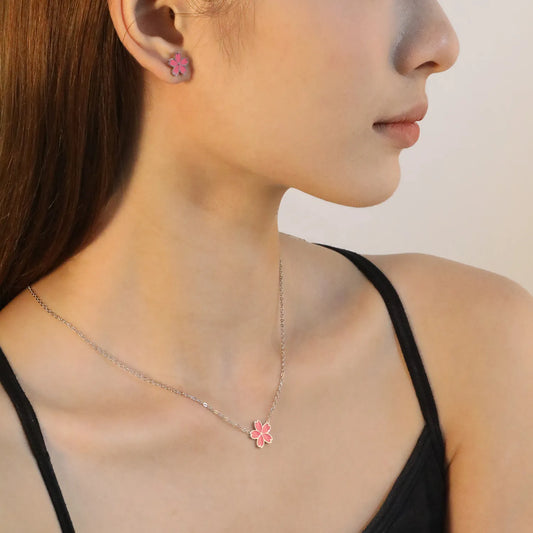10mm Cherry Blossom Pink Enamel Stud Earrings + 12.5mm Pendant Set - 0.3mm Cross Chain (45+5cm) & 6mm Tag - Stainless Steel Wholesale Jewelry