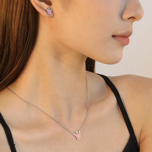 8x8.4mm Crown Pink Enamel Stud Earrings + 11.7x12mm Pendant Set - 0.35mm Cross Chain (45+5cm) & 6mm Tag - Stainless Steel Wholesale Jewelry