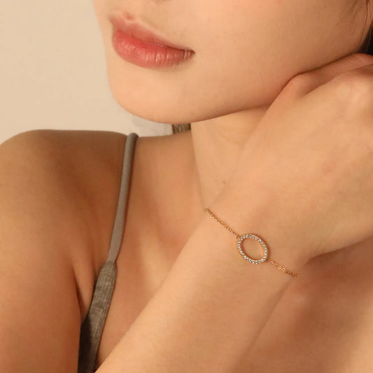 Wholesale Stainless Steel Gold Elliptical Hollow Bracelets - 14.9*11.2mm CNC White Zircon, 0.3mm Cross Chain, 18+3cm with 6mm Medallion