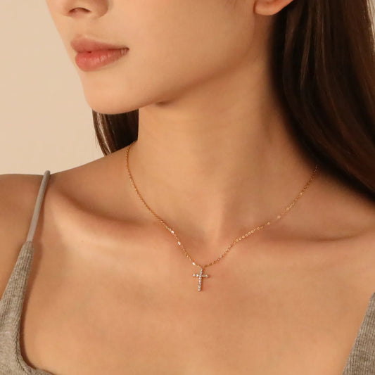 Stainless Steel Gold Cross Pendant Necklaces - 10*16.8mm CNC White Zircon, 0.3mm Chain, 40+5cm with 6mm Disk