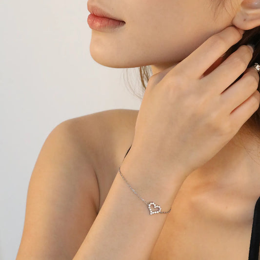 Stainless Steel Steel-Colored Hollow Heart Zircon Bracelets - 11.2*10mm, 17+3cm with 6mm Round End Plate