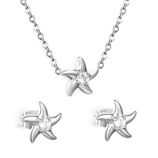 18K Gold Plated Starfish Jewelry Set | Stainless Steel CZ Crystal Necklace & Earrings | Wholesale Waterproof Beach Jewelry for Women
