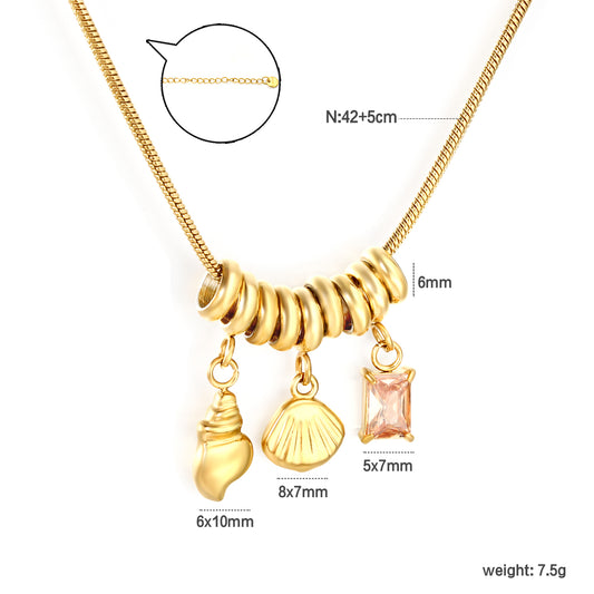 18K Gold Plated Shell Conch Charm Necklace | Stainless Steel Pink Crystal Pendant Necklace | Waterproof Beach Jewelry for Women