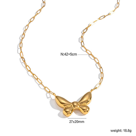 18K Gold Puffy Bow Link Necklace | 42+5cm Adjustable Chain | 27x20mm 3D Bow Pendant | Wholesale Bulk (MOQ 12)