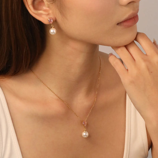 ✨💎 Teardrop Zirconia & Pearl Set: Earrings + Pendant | Gold Stainless Steel Jewelry Wholesale