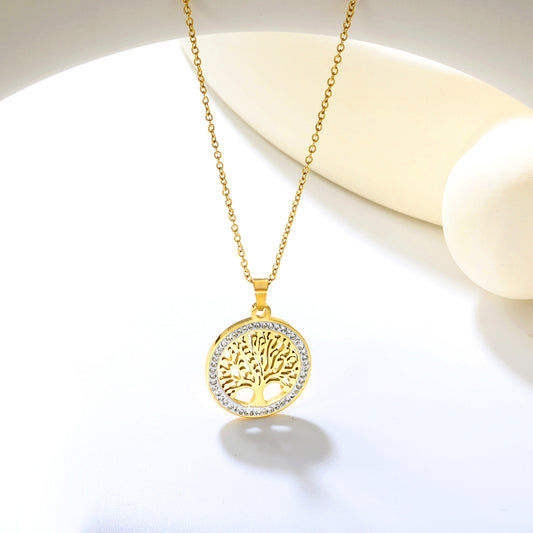 ✨ Wholesale Tree of Life Pendant Necklace - 21.9mm Hollow Circle w/ White Zircon | 40+5cm Stainless Steel Chain (5g)