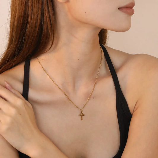 ✨ Wholesale Gold Stainless Steel Egyptian Cross Necklace | 10*15mm Smooth Cross Pendant | 0.4mm Beaded Chain 40+5cm with 6mm Lobster Clasp