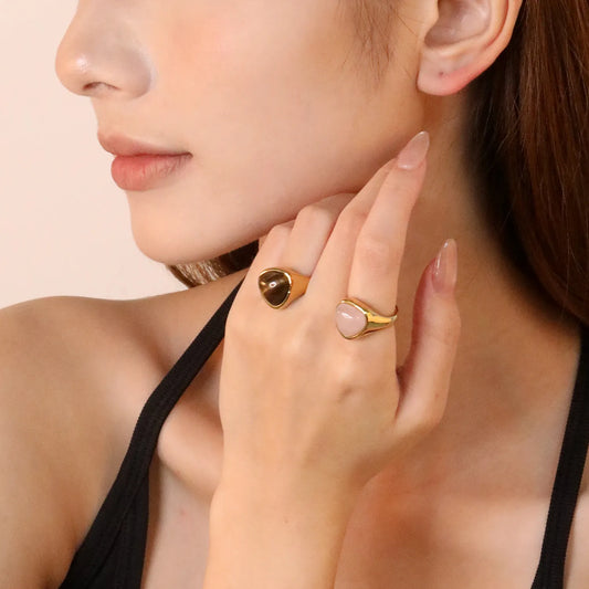 ✨ 18K Gold PVD 14.5mm High Triangular Tiger's eye stone / Rose quartz Rings Wholesale (MOQ 12+) | Stainless Steel Hypoallergenic Bands 🌍 | Stackable & Statement Rings
