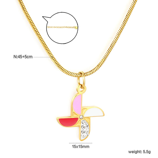 ✨ Wholesale Gold Stainless Steel Windmill Pendant Necklace | 15x15mm Pinwheel Charm with White Zirconia, 0.3mm Cross Chain 45+5cm + Round Tag