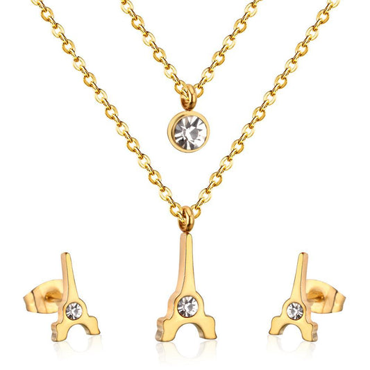 Brand New Stainless Steel Eiffel Tower Pendants Round Crystal Double Necklace Earrings For Women Dubai Jewelry Set