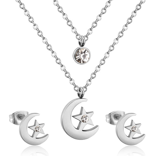 Stainless Steel Moon Star Double Chain Wedding Bridal Dubai African Jewelry Set Earring Necklace Women Jewelry sets