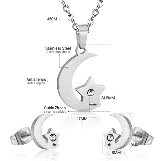 Crystal Moon Star Necklace Earring Sets Stainless Steel Dubai Indian Wedding Gold Jewelry Set For Women Girls