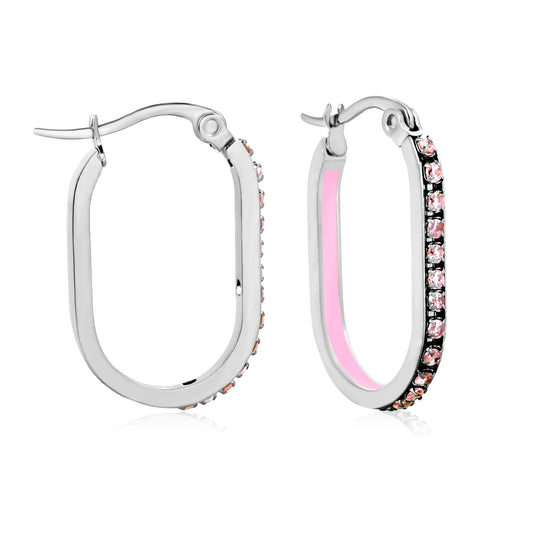 Wholesale Crystal Oval Hoop Earrings Pink Rhinestone Silver-Plated Finish Premium Stainless Steel | 2.26*22mm Size | MOQ 12+
