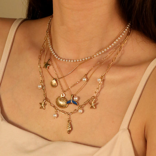 Wholesale Jewelry 18k Pvd Gold Plated Ocean Shell Conch Moon Heart Star Layered Necklace Summer Chain Pendant Necklace