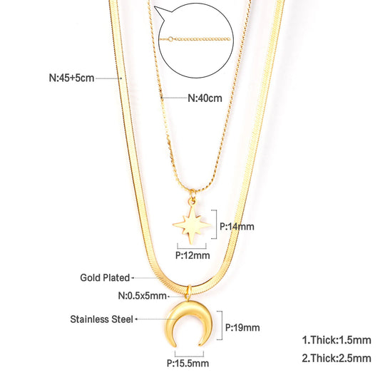 15.5x19mm Moon + 12x14mm Star Pendant Double Necklace 45+5cm