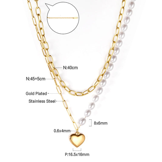Pearl + heart pendant double chain 45+40+5cm gold color