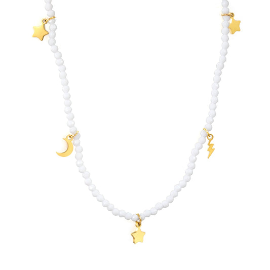 2*6.8mm Lightning + 4*6.5mm Moon + 4.3*6mm Pentagram Accessories + 2mm White/Mineral Black Beads Necklace 40+5cm+6mm Round Plaque Gold Color