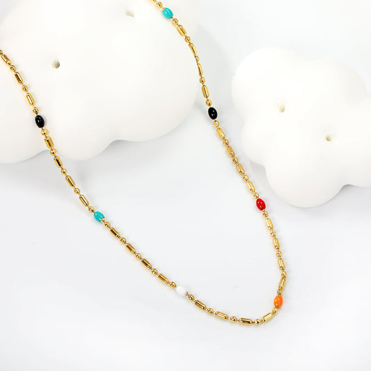Regular price $3.03 USDRegular priceUnit price / perSale price $3.03 USD11*12mm hollow cylinder with light curry/pink/blue speckled oil drop pendant necklace 1.2 square pearl chain 40+5cm+6mm round piece gold color