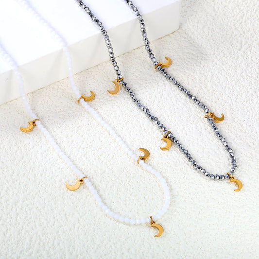 4*6.5mm moon accessories + 2mm white/mineral black beads necklace 40+5cm+6mm round plate Gold color