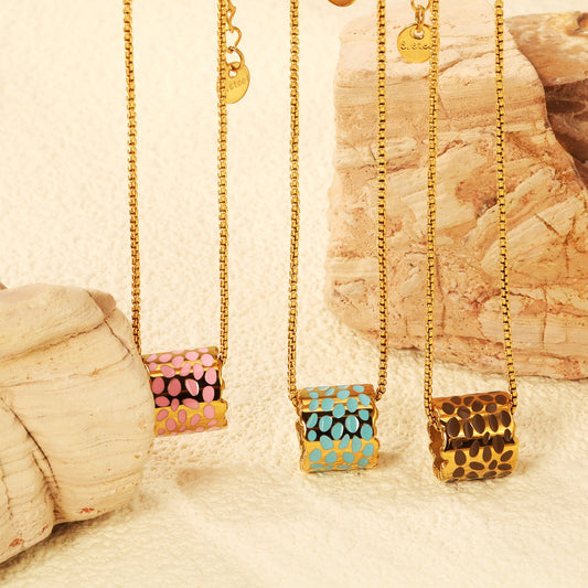 11*12mm hollow cylinder with light curry/pink/blue speckled oil drop pendant necklace 1.2 square pearl chain 40+5cm+6mm round piece gold color