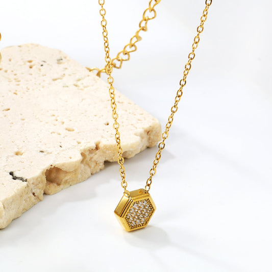 7.8*8.6mm Convex Hexagonal CNC White Zirconium Pendant 0.3 Cross Chain 40+5cm+6mm Round Necklace Golden