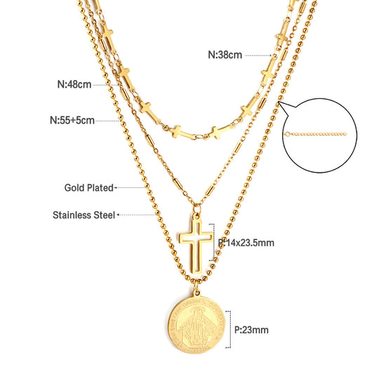 Girls Jewelry Stainless Steel Round Accessories With Pattern + Cross Accessories + Cross With Chain Three Chains Necklace