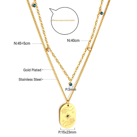 Girls Jewelry Stainless Steel Oval Hands + Blue Diamond Accessories + 5 Mixed Color Diamonds Double Chain Necklace