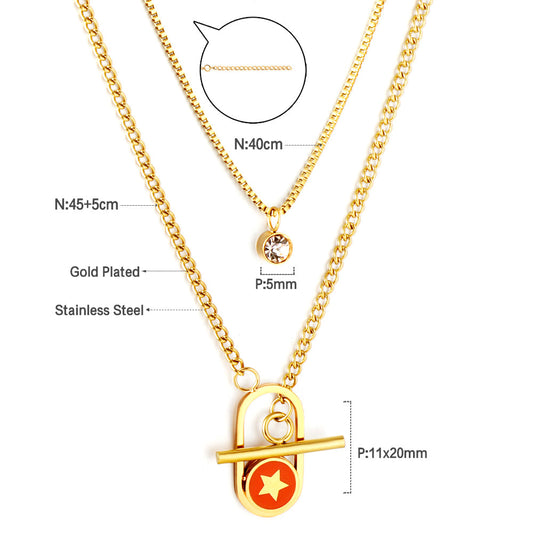 Enamel Girls Kids Jewelry Stainless Steel Oval Hollow Round Orange Drip Oil With Star + Chain With Diamond Double Chain Necklace