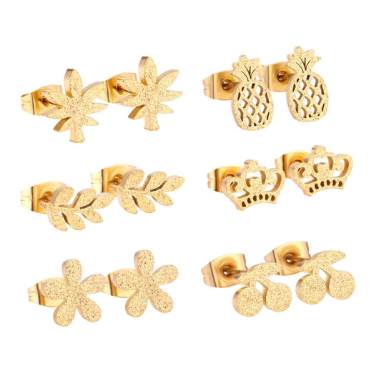 ASON 6Pairs/Box Crown/Flower/Leave Small Piercing Stud Earrings Sets Stainless Steel Gold Color Jewelry For Women Gift