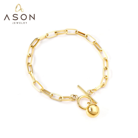 ASON Gold Color Vintage Stainless Steel Bracelet Steel Ball Pendant Toggle Clasp for Women Man Thick Bangle Fashion Jewelry