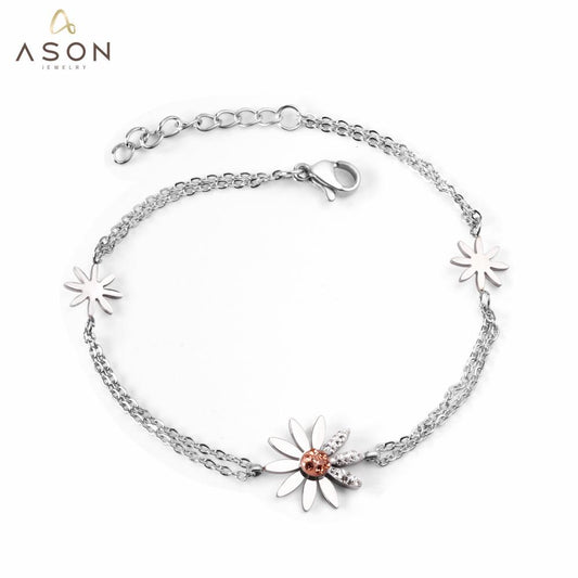 ASON Trendy Silver Color Stainless Steel 18+3 cm Daisy Cubic Zirconia Accessory Bracelets For Women Daily Wear Jewelry
