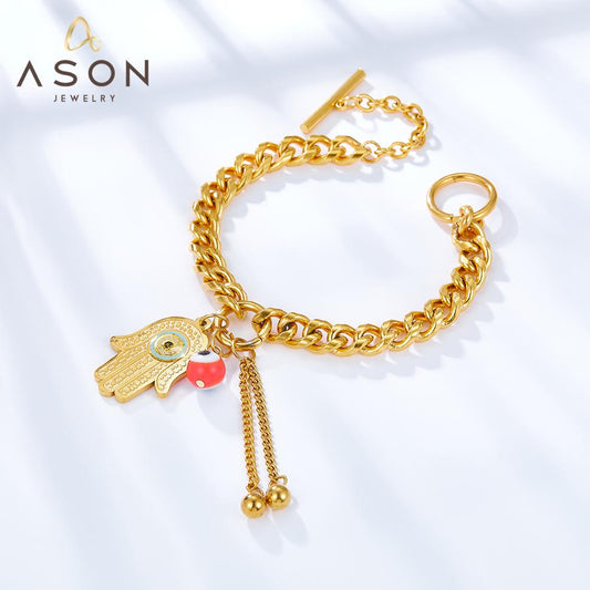 ASON Hand And Red Eye Shape Accessries With Beads Link Chians Bracelet Gold Color Stainless Steel For Women Summer Jewelry