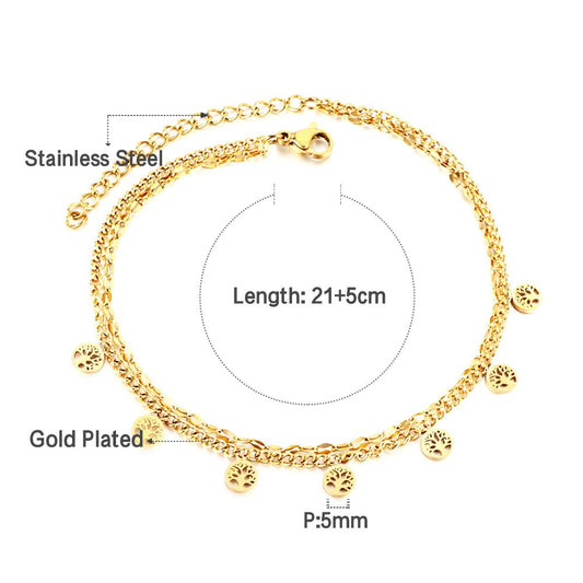 ASON Trendy Round Hollow Out Tree Accessories Multi-layer Chain Anklet Gold Color Stainless Steel For Women Fashion Jewelry