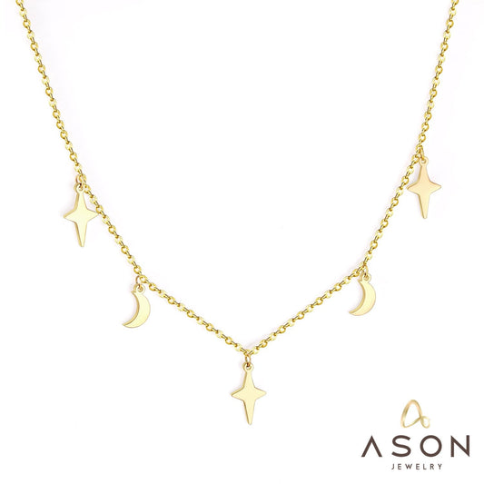 ASON Moon and Star Pendant Necklaces Gold Color Stainless Steel Chain for Women Girls Fashion Jewelry Accessories Gift