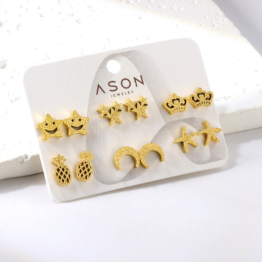 Six Pairs Mixed Snap Cut Frosted Pineapple / Starfish Stud Earrings Goldtone