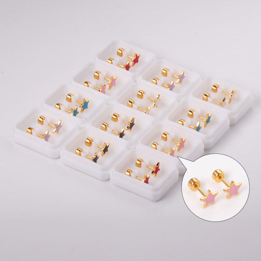 12 pairs 4mm round cake + 7mm pentagram drop glitter oil mix 6 colors earrings steel/golden
