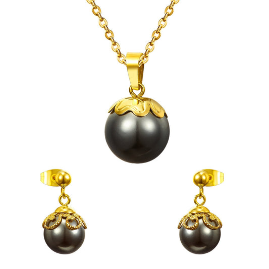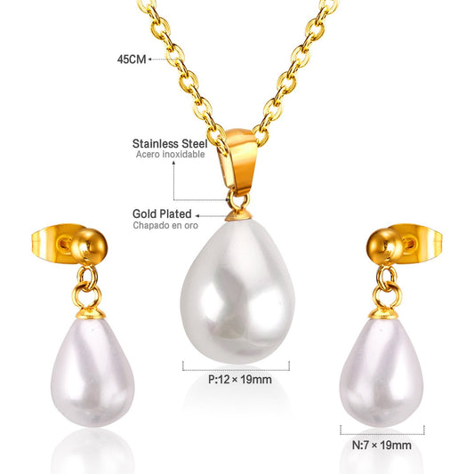 ASON Imitation Pearl Bridal Wedding Jewelry Set for Women Stainless Steel Pendant Necklace Small Stud Earring Gold Color