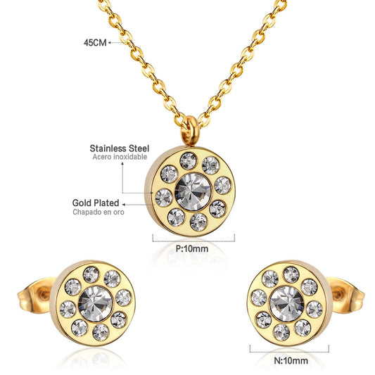 Trendy Round Crystal Pendant Necklace Stainless Steel Necklace Stud Earrings Sets For Ladies Wedding Jewellry Set