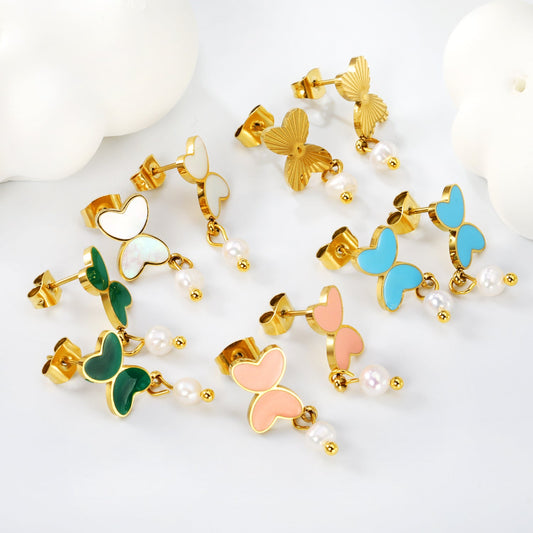 7.8*11mm Butterfly with cut corrosion surface/white shell/pink/light blue/green oil drops + 4mm freshwater pearl earrings Gold color