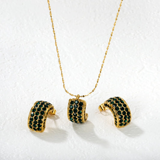 ✨ Wholesale PVD 18k Gold Emerald Green/White Zircon C-Shape Jewelry Set | Stainless Steel Earrings & Pendant