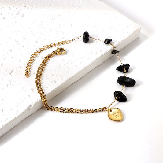 6 black shaped zirconias + semi-double chain with heart anklet 21+5cm gold color
