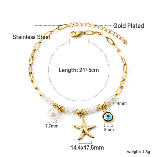 8 white pearls + 6 steel beads with white pearls + starfish + blue eyes anklet 21+5cm gold color