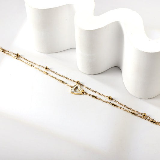 11 Cylinders + 6 Steel Beads with Hollowed Out White Diamonds Heart with Crown Double Chain Anklet 22+5cm GOLD