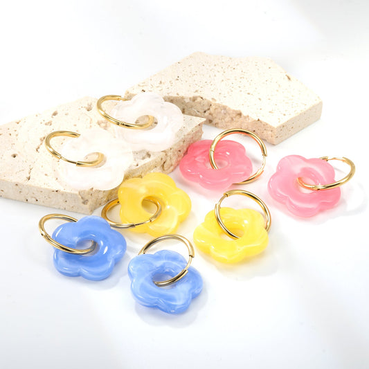2*18mm I.D. Earrings + 27mm White/Red/Blue/Yellow/Coffee/Pink/Peacock Blue/Peacock Green Resin Flower Earrings Gold Color