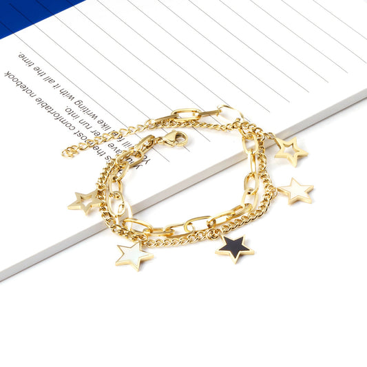 14K Double Chain Pentagram Black Shell with White Shell Bracelet Steel Color 17+3cm