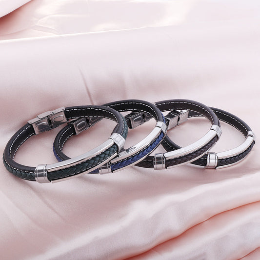Black & Brown & Green & Blue Leather Soft Bracelet Steel Color