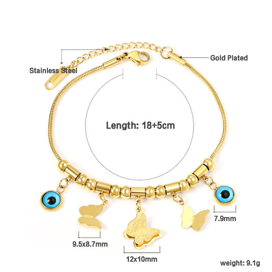 3 large and small butterflies 12*10mm+2 round blue eye pendants 8mm+10 round pass beads+5 round pass posts Bracelet 18+5cm Gold color