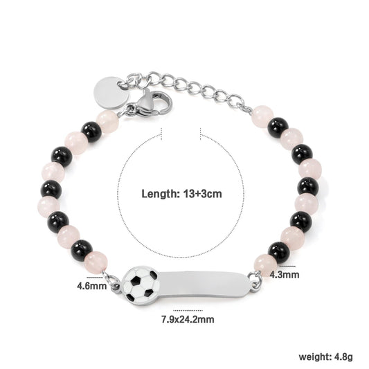 7.9*24.2mm long strip with soccer ball graphic + 4.6mm*12 pink beads + 4.3mm*10 black beads bracelet 13+3cm