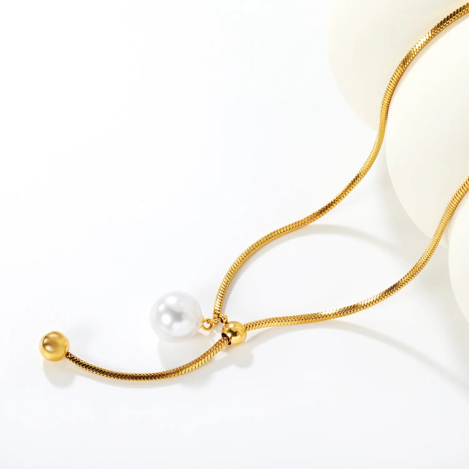 ✨ Wholesale Gold Stainless Steel Adjustable Chain Necklace | 13mm Artificial Pearls & 7mm Dual Ring Pendant, 65cm Lightweight Chain, 13.4g, Minimalist Jewelry Bulk